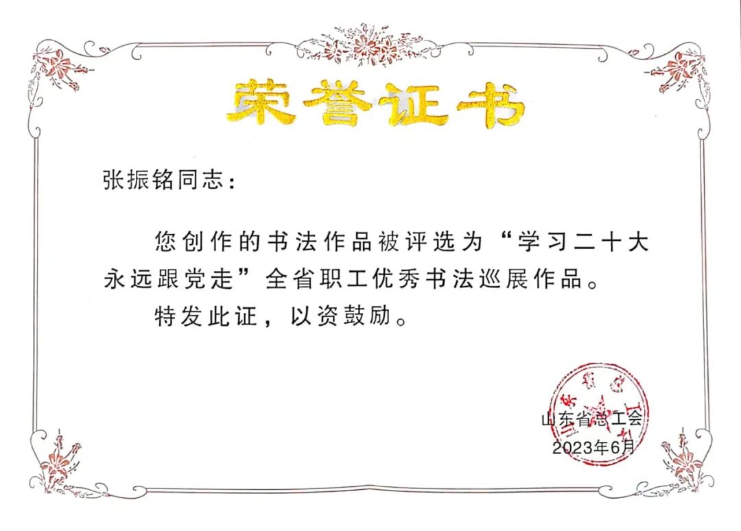 奧翔公司員工張振銘書(shū)法作品被評為全省職工優(yōu)秀書(shū)法巡展作品