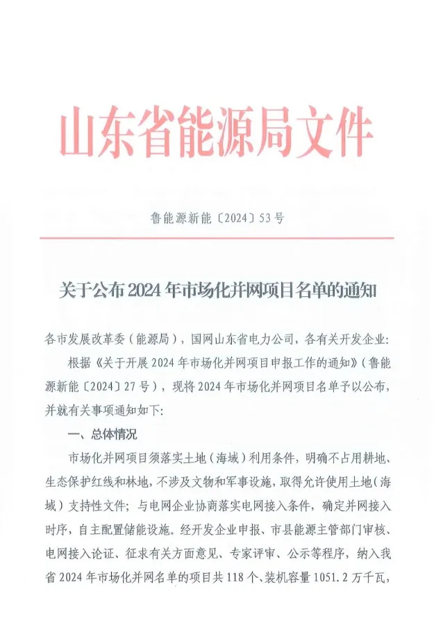 能源資訊丨光伏項目10.46GW!山東2024年市場(chǎng)化并網(wǎng)項目名單公布(附完整名單)